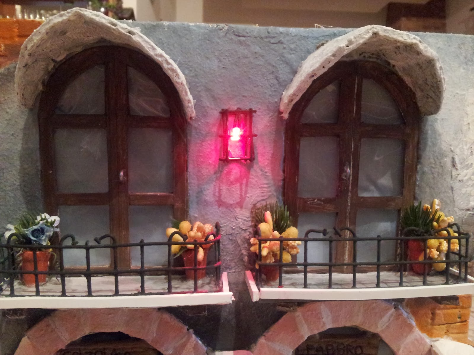 incomincia a prendere forma l'ambientazione ho applicato delle miniature (vasi fioriti,sedia,anfora con pianta)una fioriera nella nicchia della Madonnina,e ho messo una tenda sopra il portoncino sabato 4 gennaio 2014