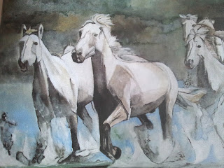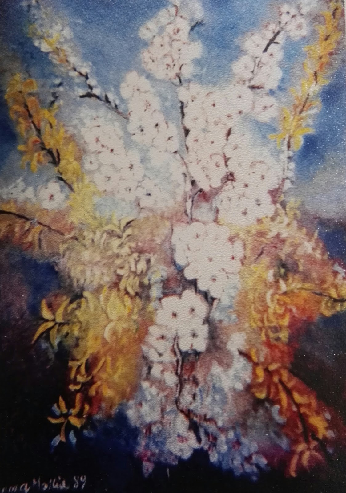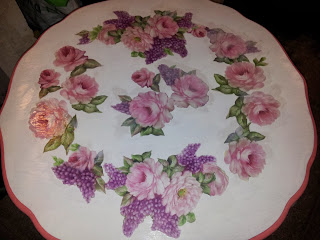 - ho incollato le rose secondo un disegno da me prestabilito con il vinavil e sempre con il vinavil ho fatto in modo che non ci fossero strati di carta alzati....quando le rose hanno aderito al tavolo sono passata alla sezione pittura....