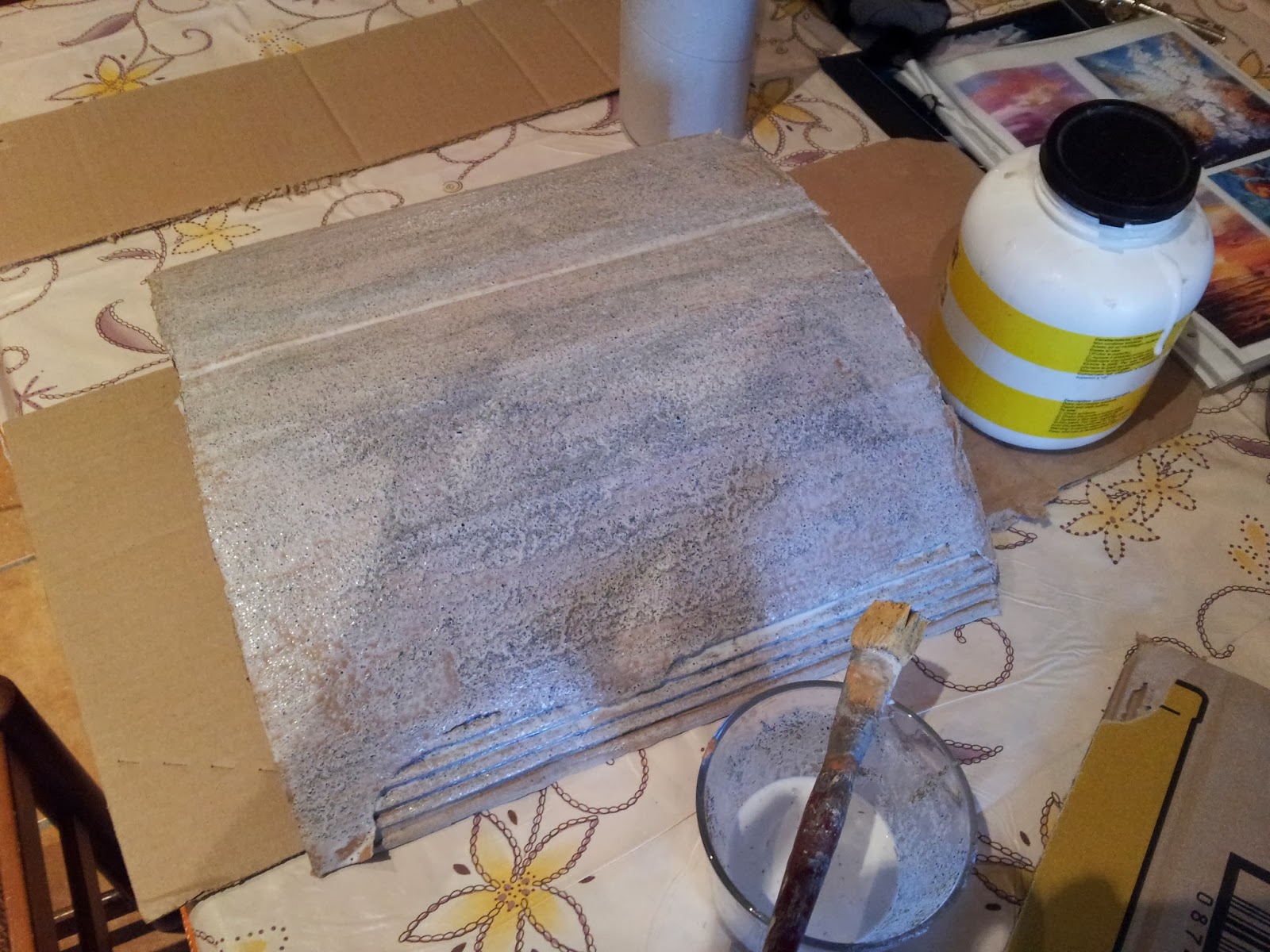 e mano mano lo induriamo sempre di piu' con la colla....poi facciamo i particolari ,le finestre,la porta i balconi e lo collochiamo sopra una base di polistilene dove andremo a creare gli scogli...