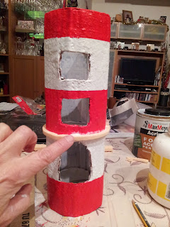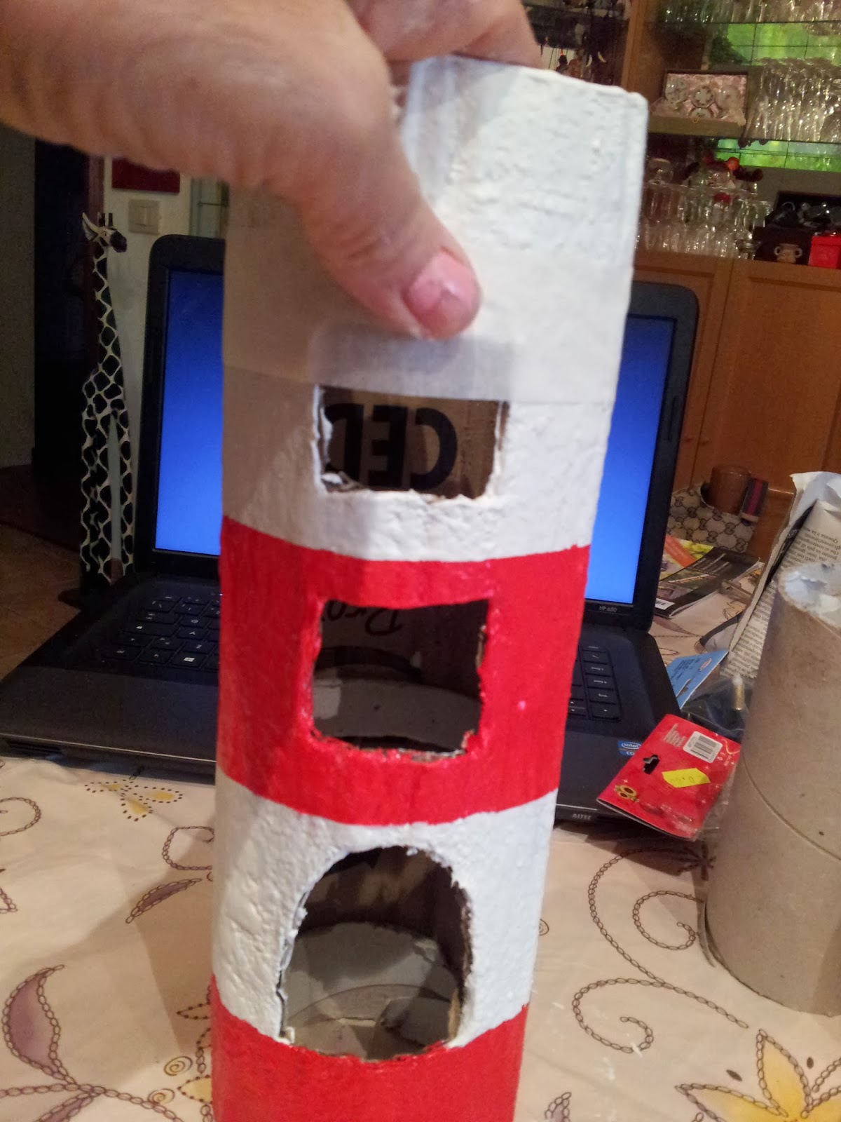 e' da un pezzo di cartone che nasce la mia idea di realizzare un faro con orologio....lavorato con colla e sabbia riesco a dare al cartone una forma cilindrica