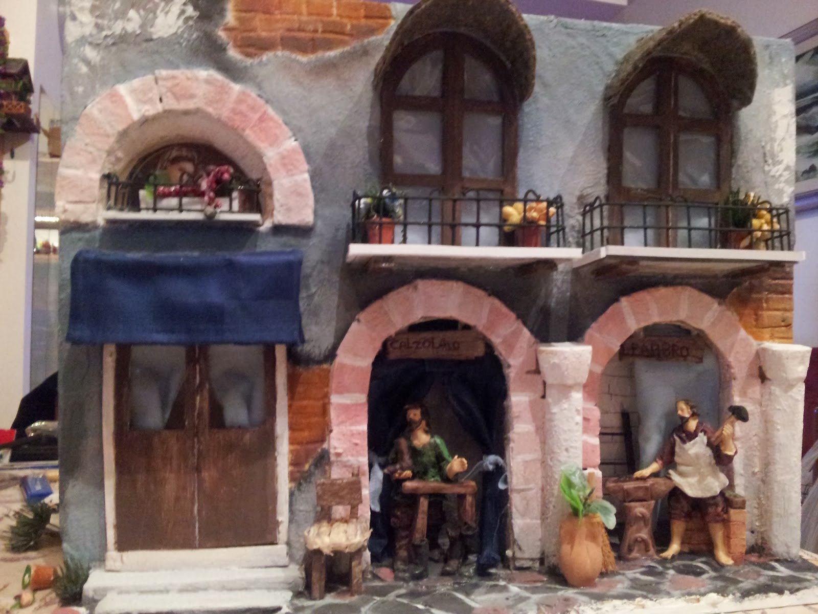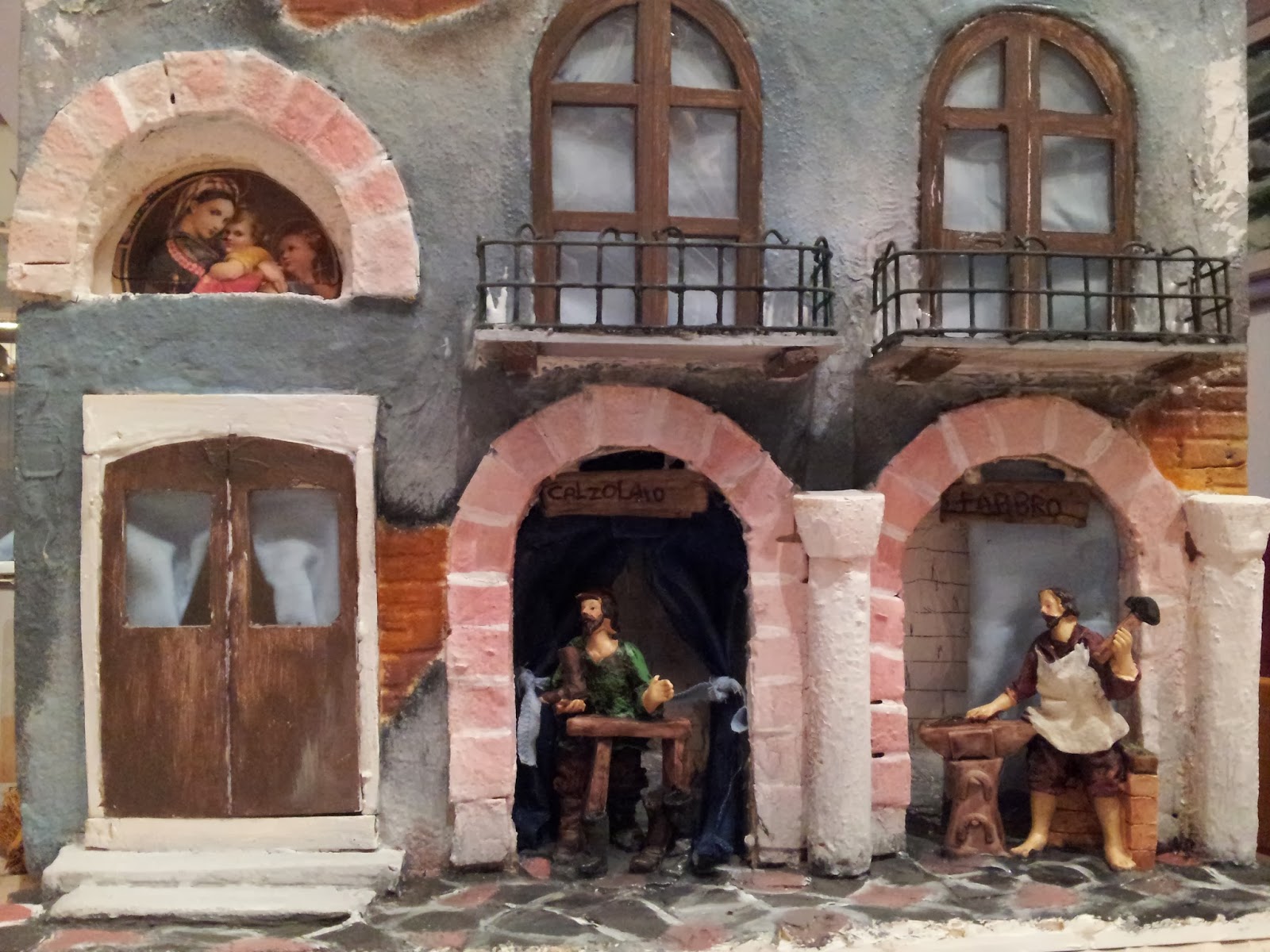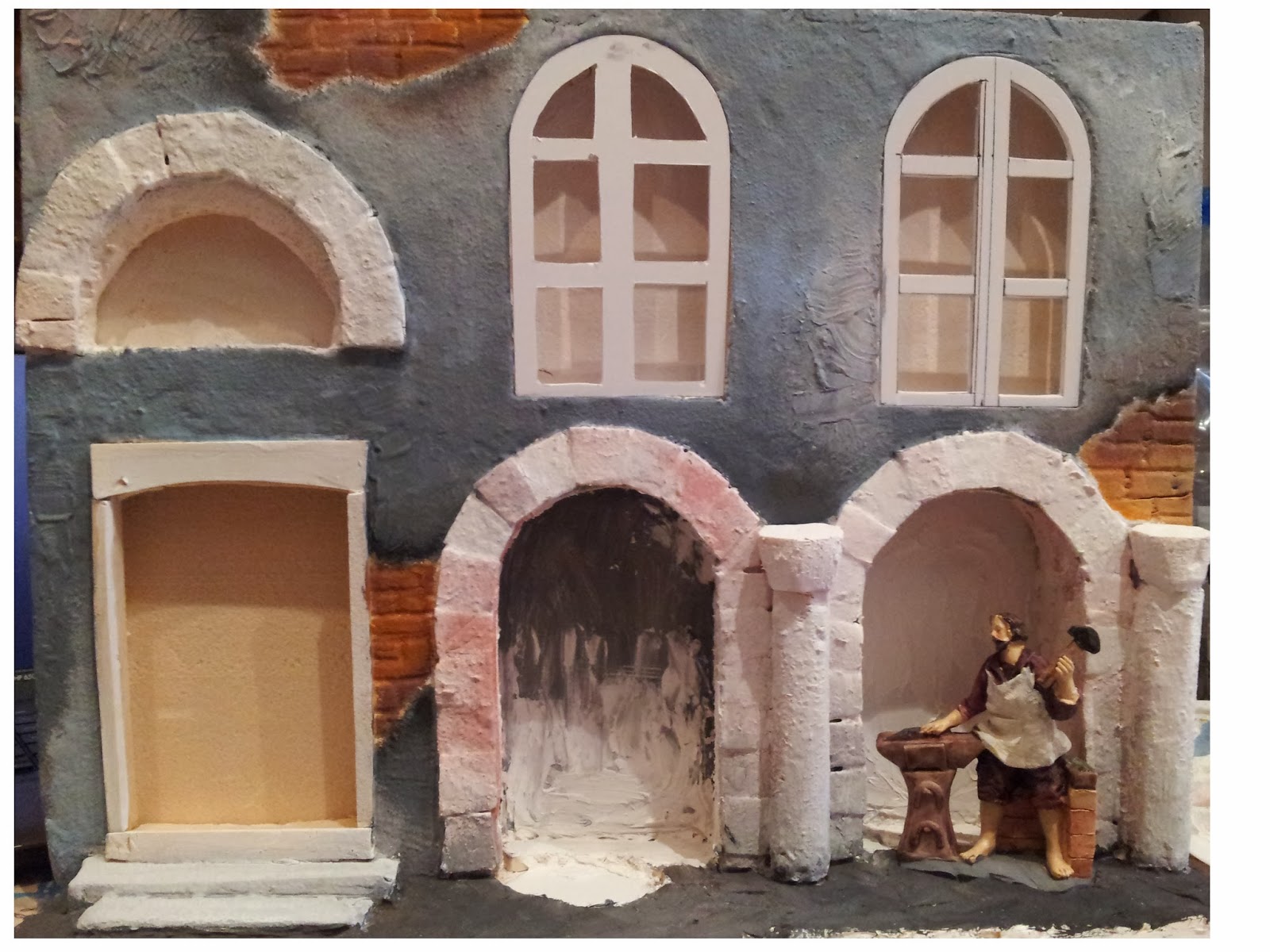 dopo di che....cominciamo a dare vita ai colori della facciata...in evidenza i mattoncini color ruggine dove il muro e' scorticato sempre con il polistilene faremo le due colonne e i mattoni intorno alla nicchia e ai locali dei personaggi (fabbro e calzolaio)con il forex abbiamo creato i finestroni....
