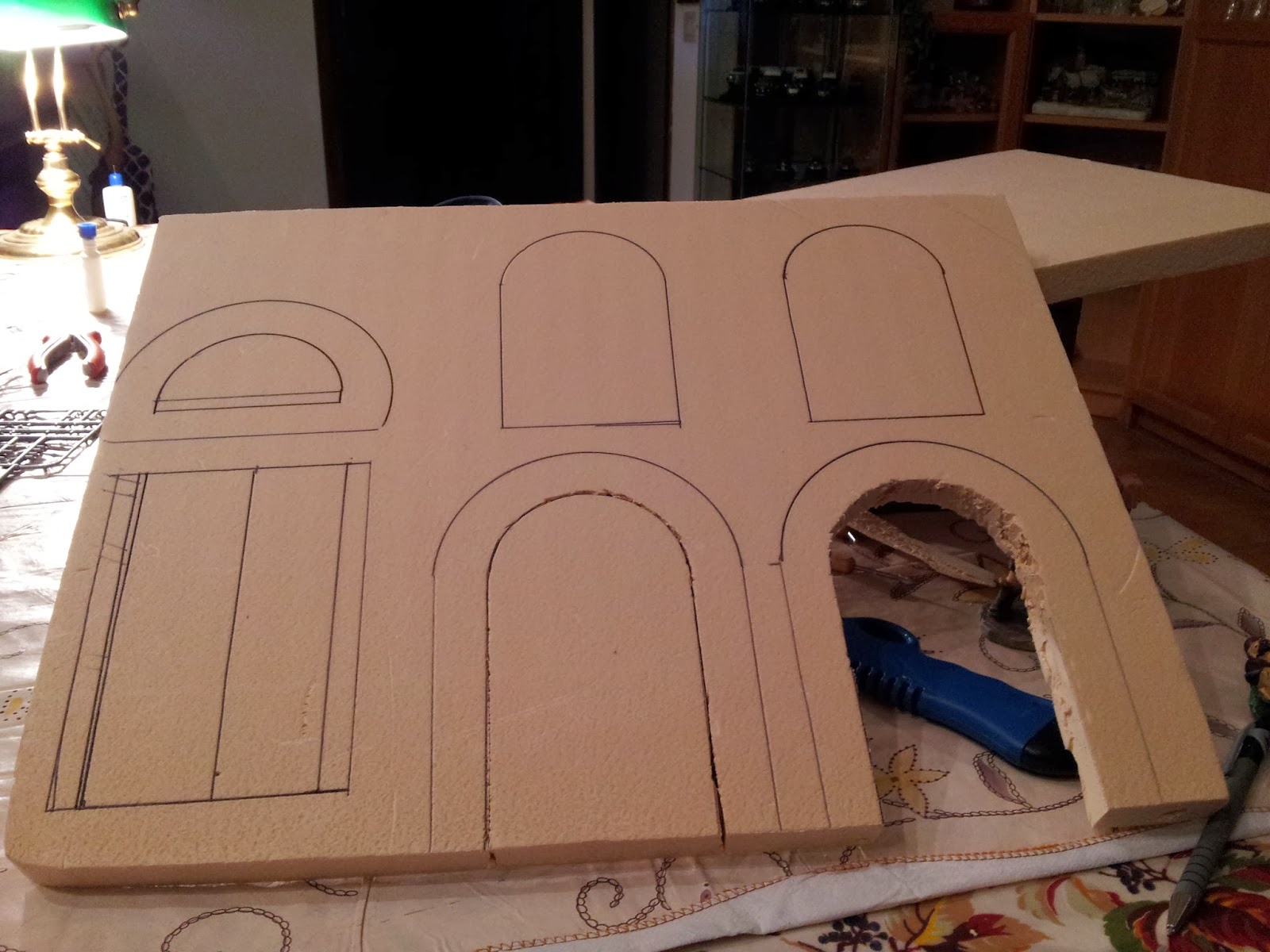 disegniamo sul polistilene le porte e le finestre che poi andremo a ritagliare con il taglierino applicheremo poi una seconda lastra di polistilene dietro la prima della stessa misura sara' il suo sfondo